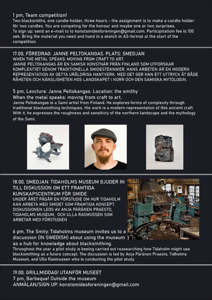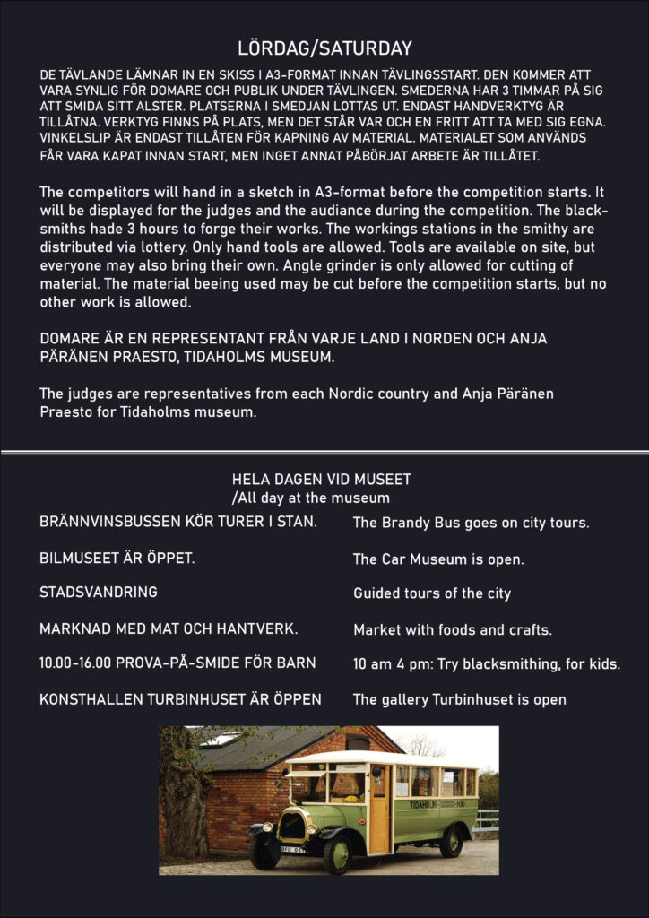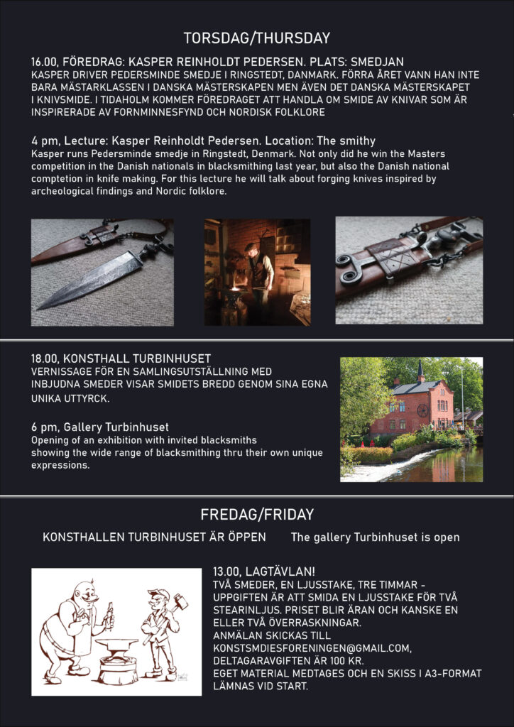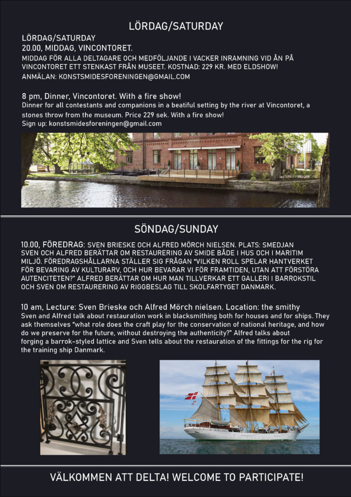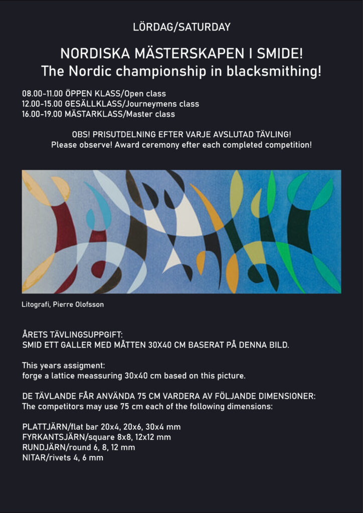 Nordisk smidesfestival med tävlingar, föreläsningar, workshops och utställningar. Här möts vinnare från svenska mästerskap och våra nordiska grannländer. Mer information kommer i JERN och via e-post.